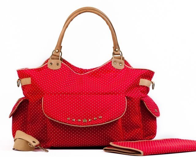 Exterior: Confeccionado en gabardina estampada (rojo con pintitas blancas) super gruesa, con tres bolsillos externos y correa regulable. Manijas y detalles de eco cuero